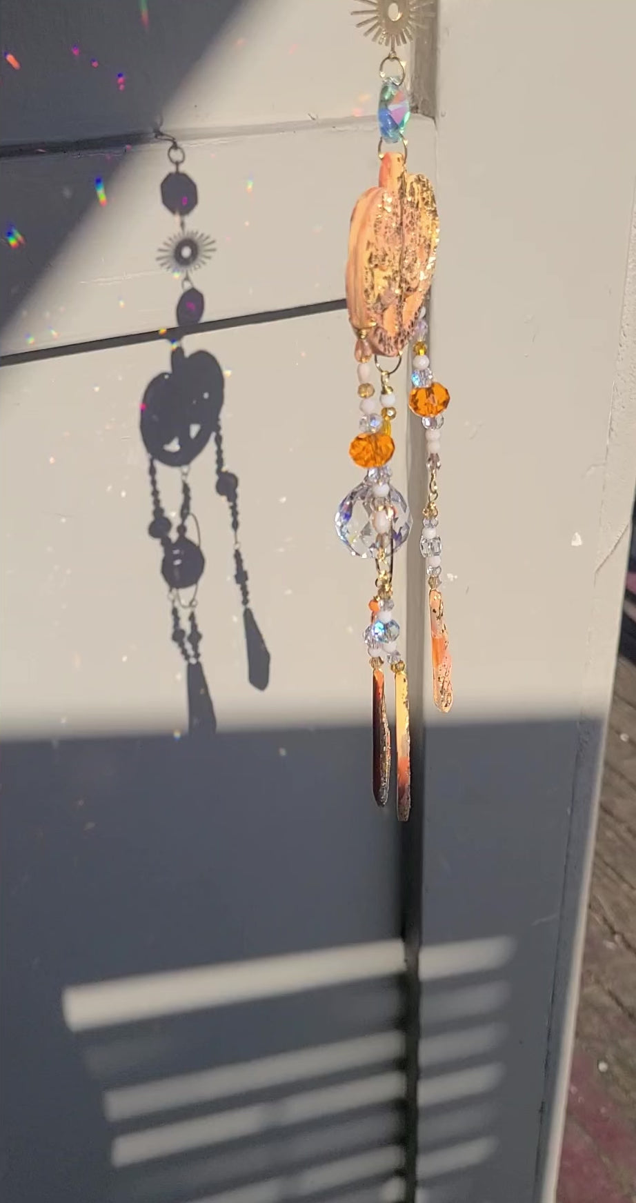 This Suncatcher features orange and gold polymer clay pendants. Gold accents and faceted glass beads with glass mini prisms and a 25mm glass prism.