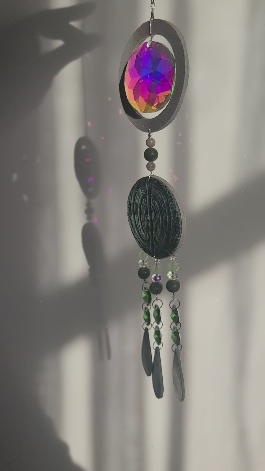 This Suncatcher features our faux Pounamu and stone polymer clay accents. Adventurine and faceted beads with multiple glass prisms.